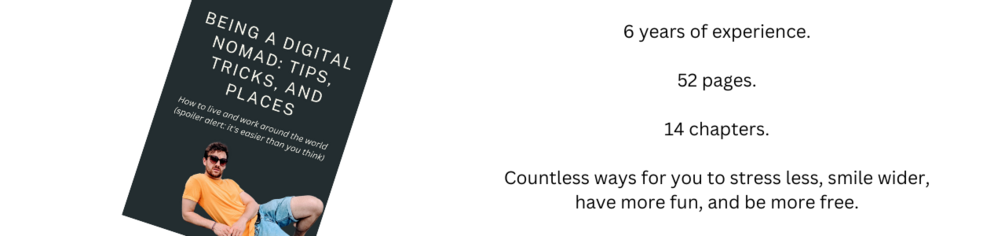 - Chapter 4: Tips for Being Productive as a Digital Nomad: if you think you’ll spend all your hours lazing about on the beach, you better think again. Sadly, no matter where you are, you still need to work. So I’ve covered 7 hacks for how you can effectively balance fun with work, and not end up hating yourself.